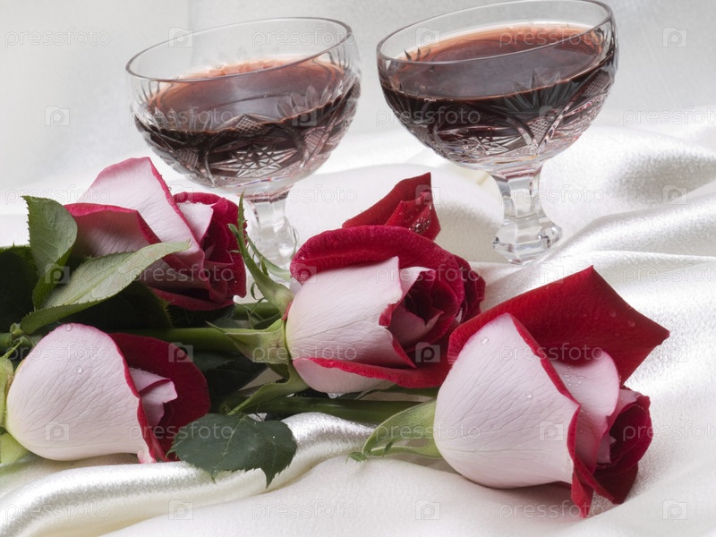 Два бокала вина и красные розы
