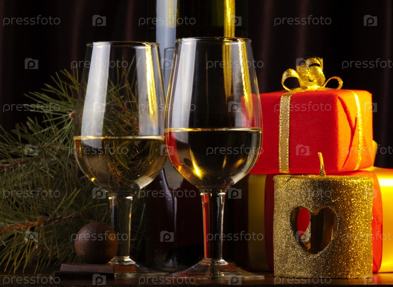 Новогодние подарки и два бокала с шампанским