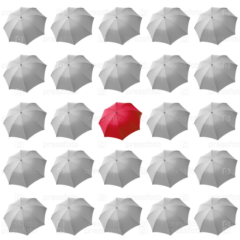 Один красный зонт среди белых зонтов