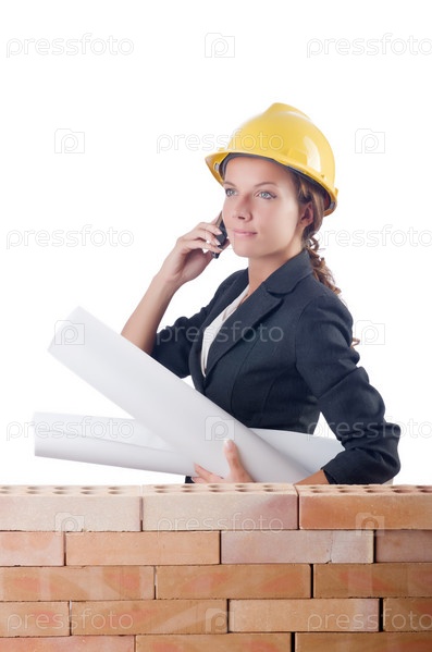Бизнес-леди в каске с чертежами в руках