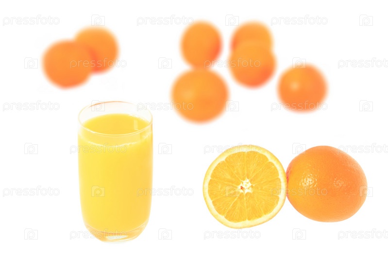 Апельсины и стакан апельсинового сока на белом фоне