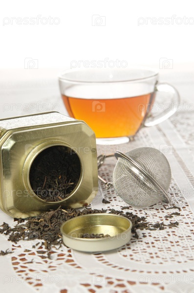 Сухой чай в металлической баночке, ситечко и стеклянная чашка с чаем