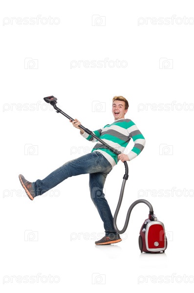Забавный человек с пылесосом