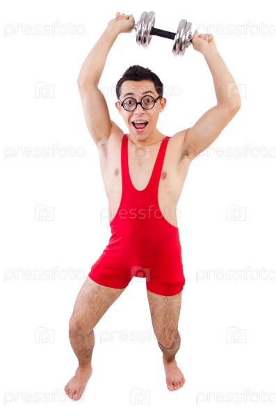 Забавный парень с гантелями