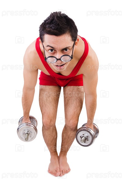 Забавный парень с гантелями