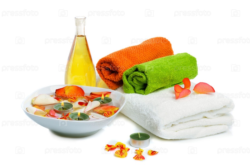 Миска с лепестками роз, свечи и полотенца на белом фоне