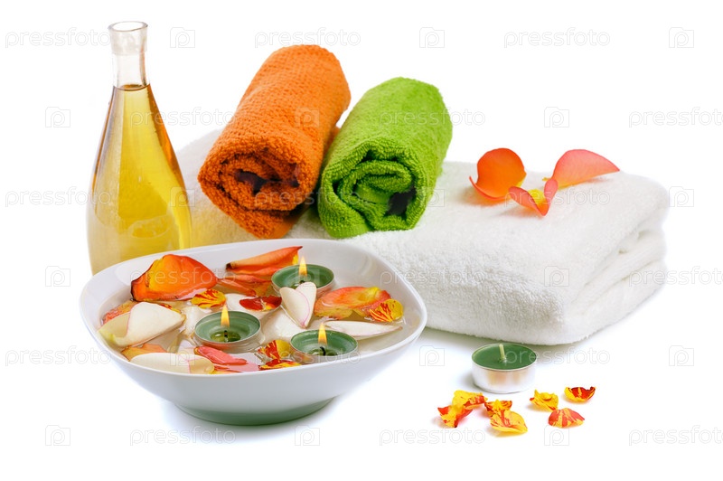 Миска с лепестками роз, свечи и полотенца на белом фоне
