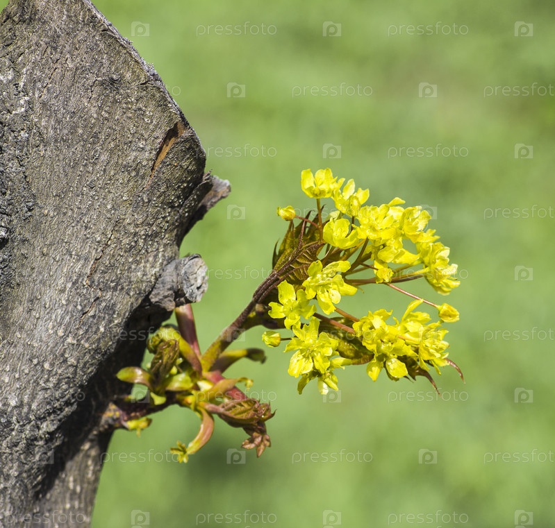 Цветки на стволе клена