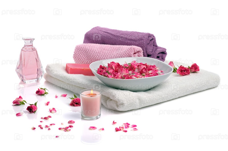 Миска с лепестками роз, цветы, свеча и полотенца на белом фоне
