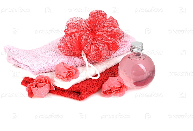 Мыло, мочалка, цветы и полотенца на белом фоне