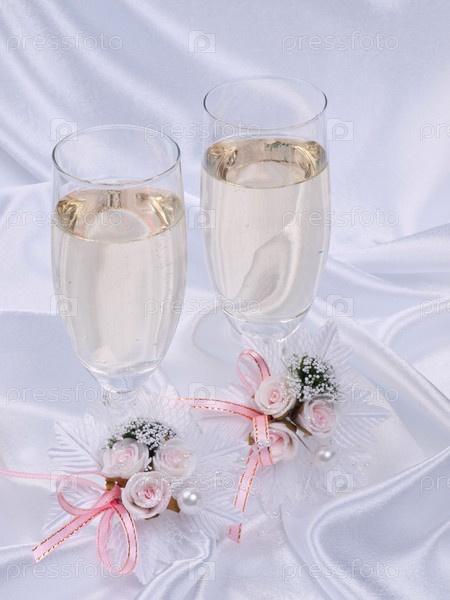 Бокалы с шампанским на белой ткани