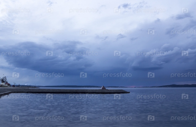 Облачное небо над набережной озера на закате