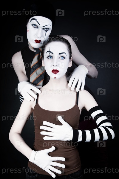 Мим соблазняет женщину на черном фоне
