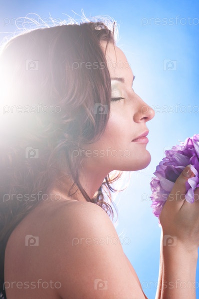 Красивая молодая женщина с закрытыми глазами держит большой цветок