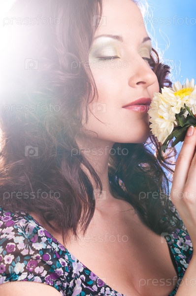 Красивая молодая женщина с закрытыми глазами держит белый цветок