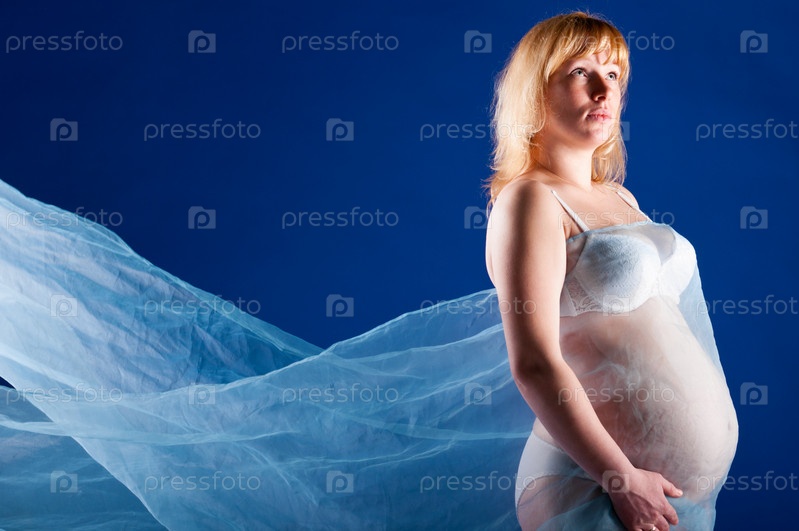 Портрет беременной женщины в легкой ткани на синем фоне