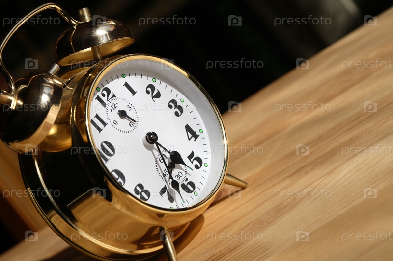 Золотой будильник на деревянном столе