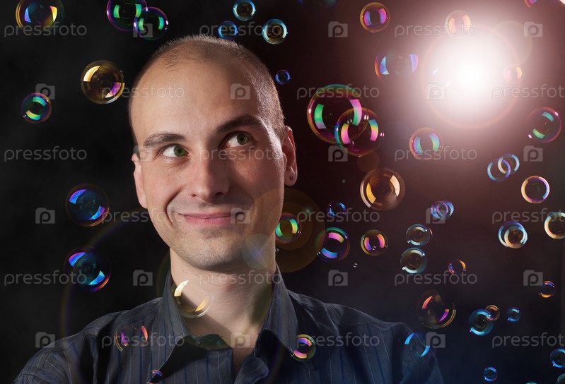 Близкий портрет человека с мыльными пузырями