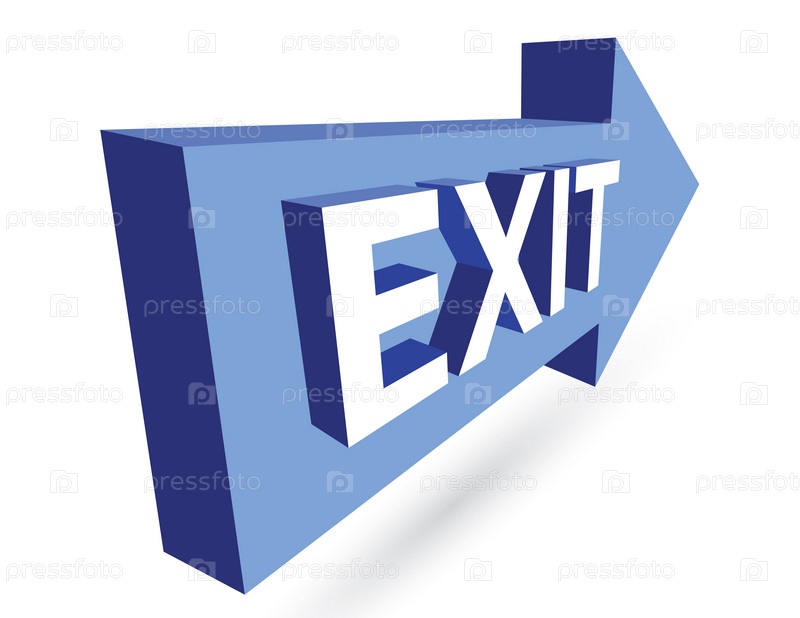 Трехмерная голубая стрелка с надписью "выход" на белом фоне