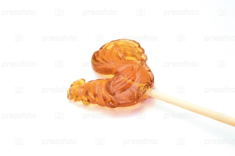 Золотой петушок на палочке на белом фоне