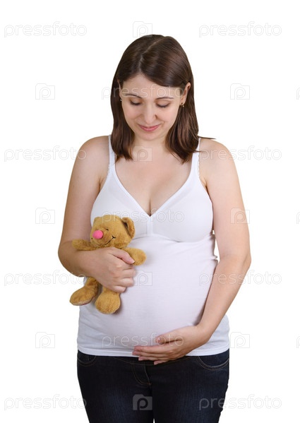Улыбающаяся молодая беременная женщина с плюшевым мишкой