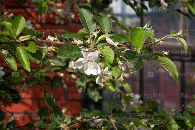 Белые цветки яблони в яркий солнечный день