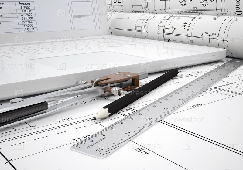 Архитектурные чертежи и ноутбук