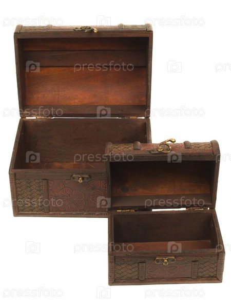 Две старых пустых шкатулки из дерева на белом фоне