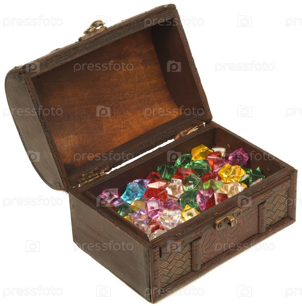 Старый деревянный сундучок с разноцветными камешками на белом фоне