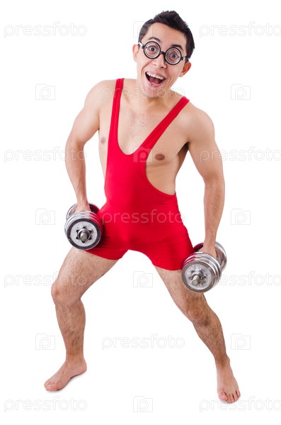 Забавный парень с гантелями