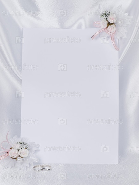 Приглашение на свадьбу с цветами и обручальными кольцами на фоне белого шелка