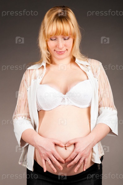 Беременная женщина на сером фоне