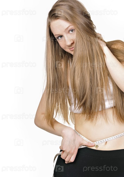 Молодая красивая женщина с измерительной лентой на белом фоне