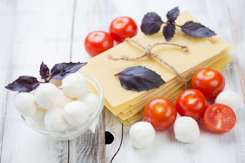 Листы лазаньи, красные томаты черри, шарики моцареллы и базилик
