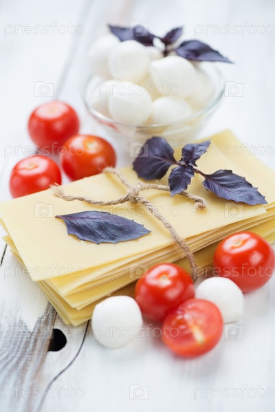 Листы лазаньи, красные томаты черри, шарики моцареллы и базилик