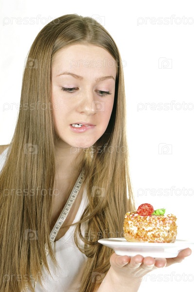 Симпатичная молодая девушка с пирожным и измерительной лентой на белом фоне