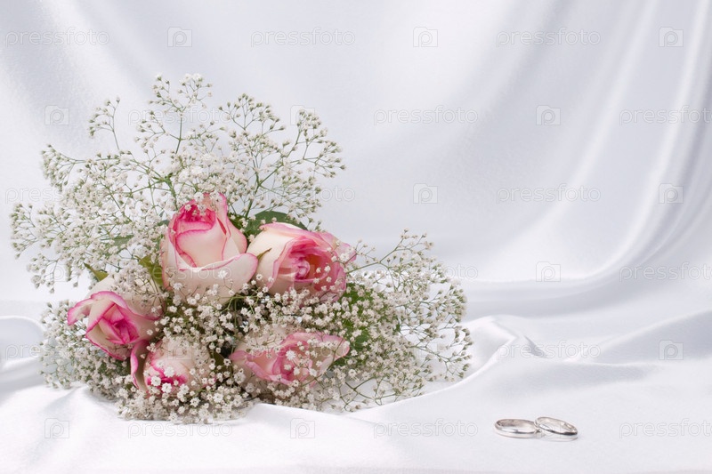 Букет роз и обручальные кольца на фоне белого шелка