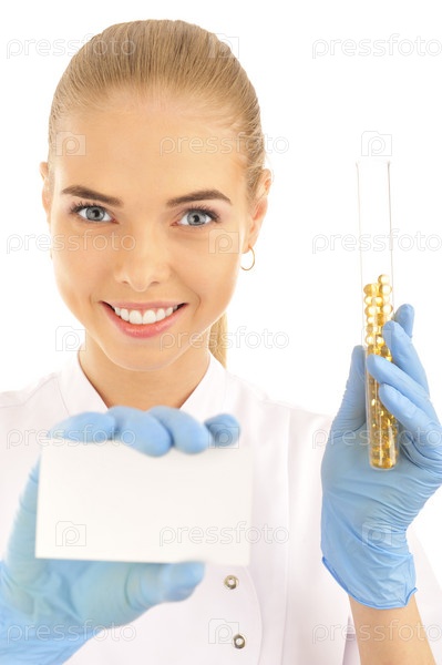 Симпатичная молодая врач с пустой карточкой на белом фоне
