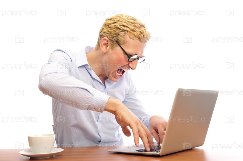 Нервный молодой бизнесмен, работающий с ноутбуком на белом фоне
