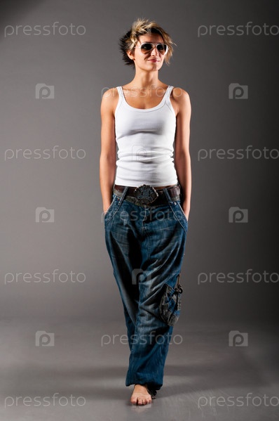 Красивая молодая женщина в белом топе и джинсах на сером фоне