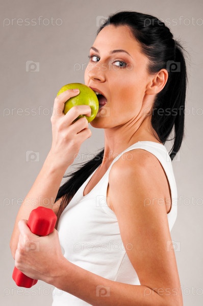 Молодая женщина держит красную гантель и ест яблоко на сером фоне
