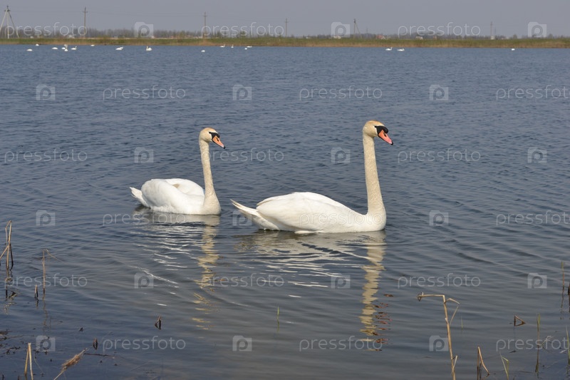 Пара белых лебедей на озере
