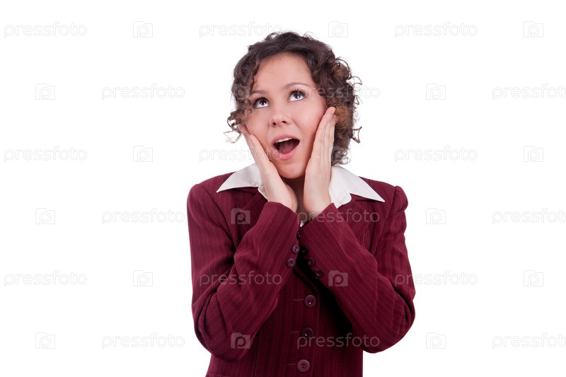 Удивленная деловая женщина на белом фоне