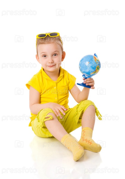 Маленькая девочка с глобусом в руке на белом фоне