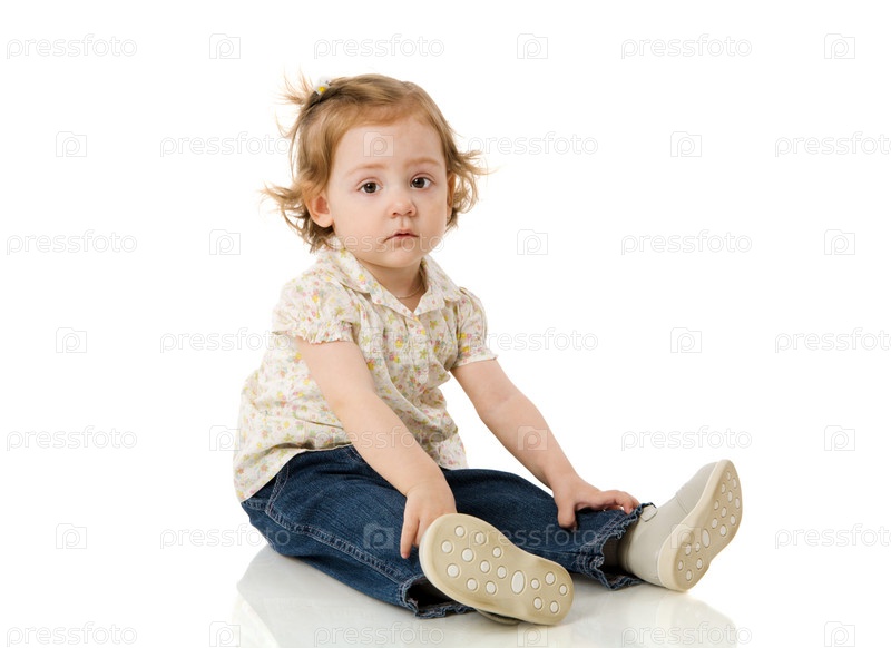 Маленькая девочка, сидяшая на белом фоне