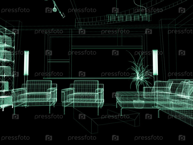 Современный интерьер гостиной, 3D-рендеринг на черном фоне