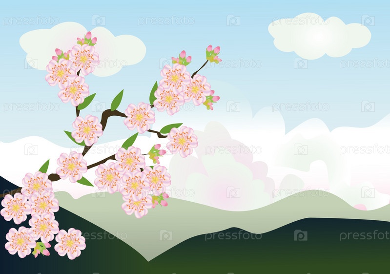Цветущая веточка на фоне гор и голубого неба