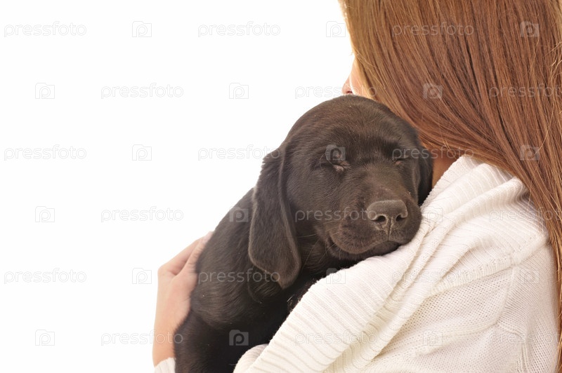 Молодая женщина с щенком, изолированы на белом фоне
