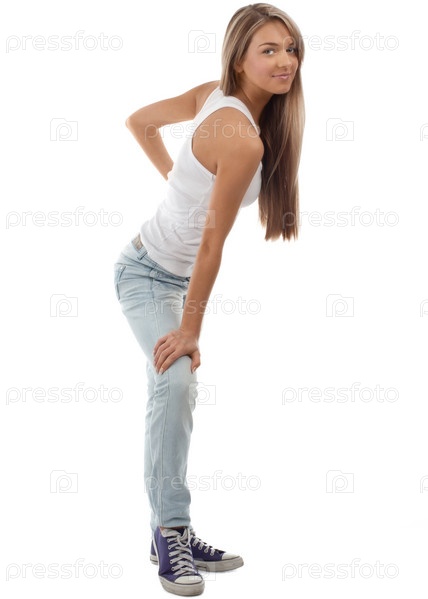 Молодая девушка с длинными светлыми волосами в повседневной одежде позирует на белом фоне