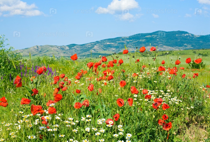 Горный пейзаж с красными маками и белыми ромашками